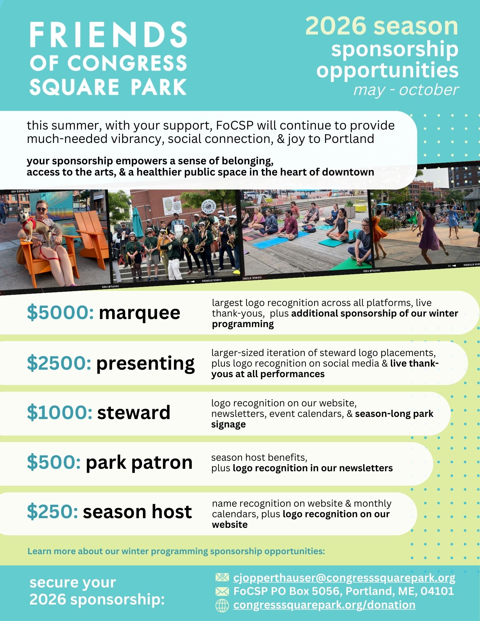 Checks can be mailed to: Friends of Congress Square Park, PO Box 5056, Portland, ME 04101